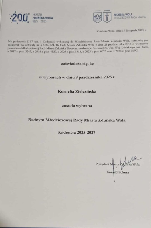 Z wielką radością pragniemy poinformować że uczennica naszej szkoły Kornelia Zielezińska została wiceprzewodniczącą Młodzieżowej Rady Miasta.