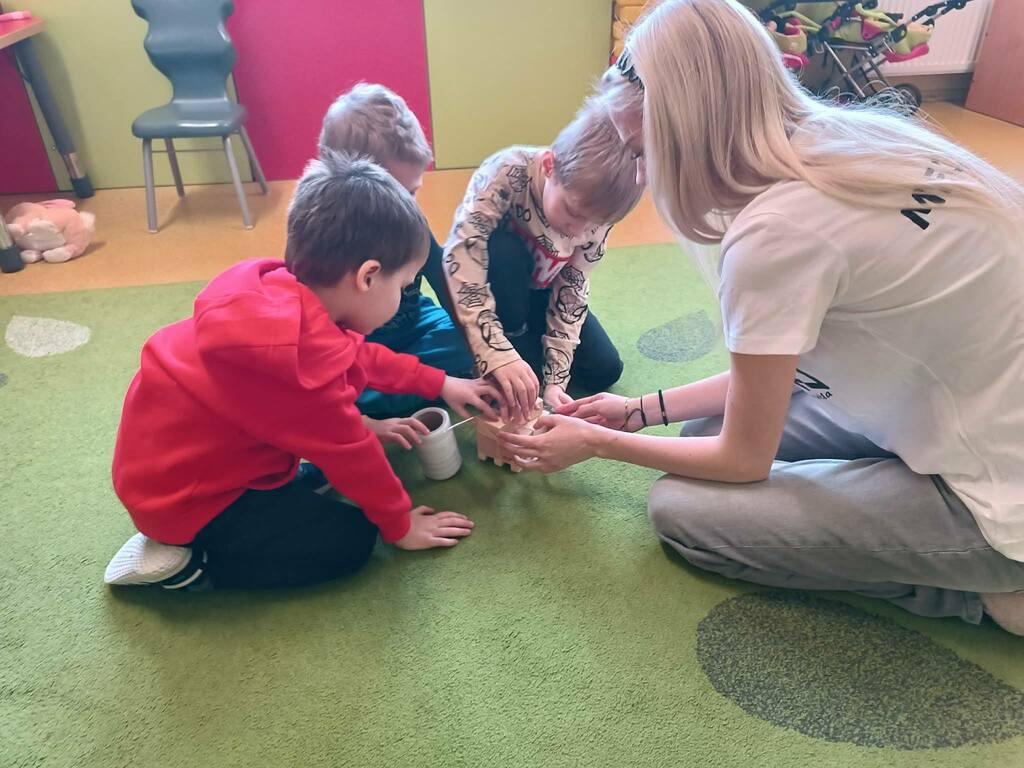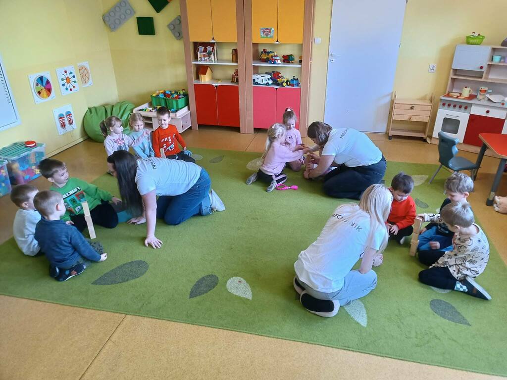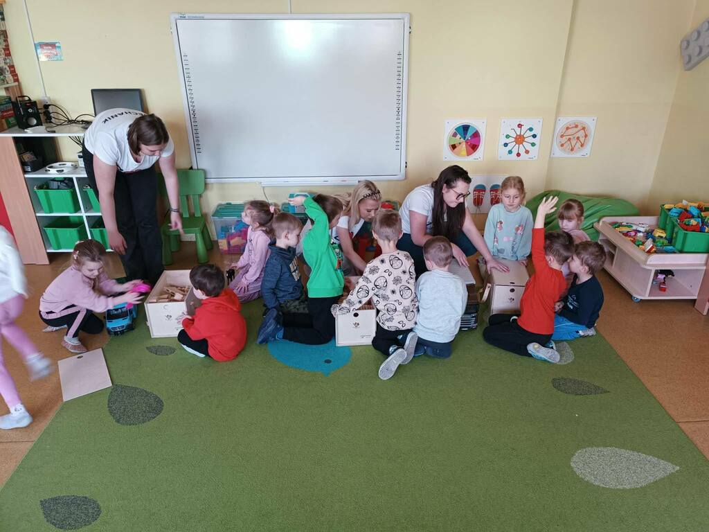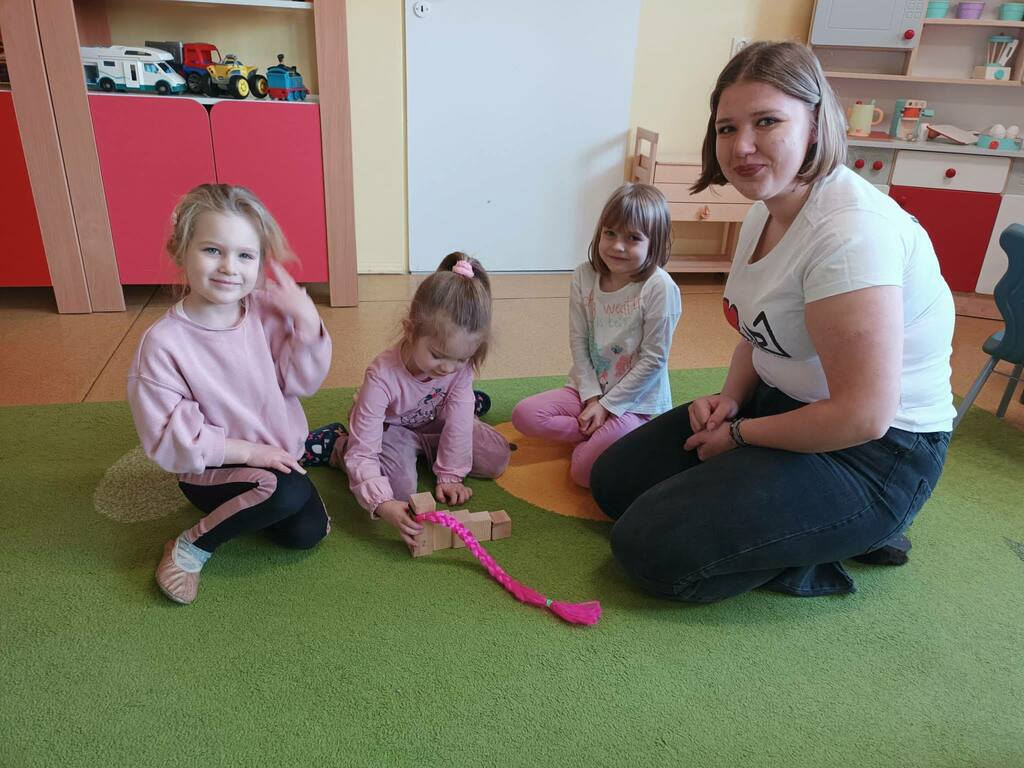Podczas zajęć dzieci pracowały w małych grupach — układały klocki na paletach, budowały wieże oraz segregowały elementy od najmniejszego do największego, rozwijając przy tym współpracę i logiczne myślenie.