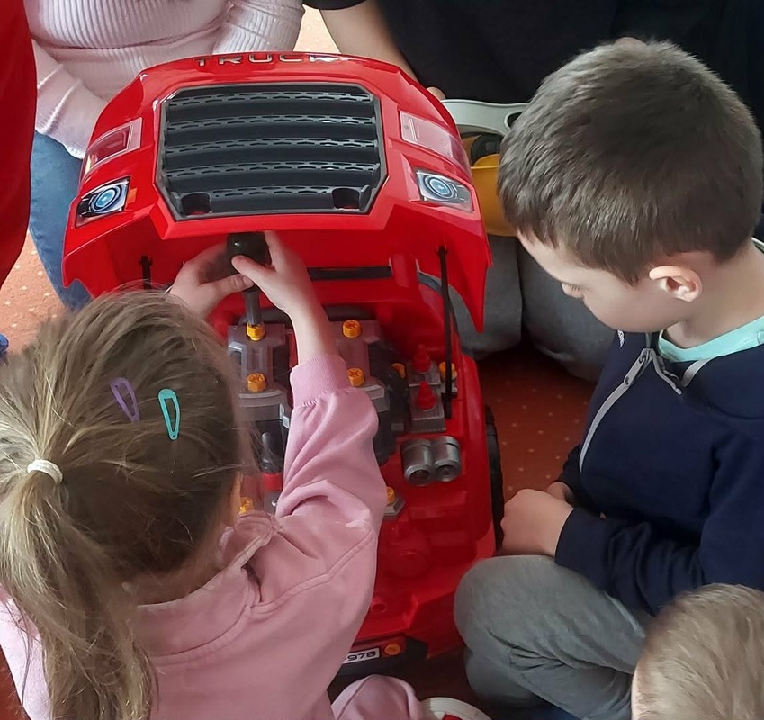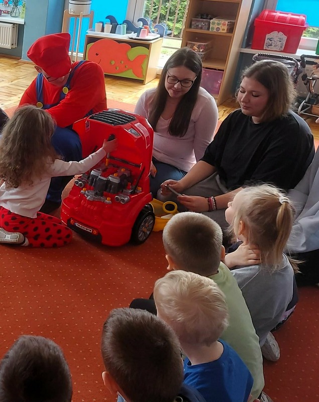 Młodzież zaprezentowała podstawowe narzędzia wykorzystywane w tym zawodzie oraz opowiedziała, jak wygląda samochód „pod maską”. Dzieci miały również okazję spróbować swoich sił w praktycznych działaniach – wkręcały i wykręcały śruby, poznając, jak wygląda zmiana koła, a także pracowały w zespołach, składając pojazdy z różnych elementów. Ćwiczenia te rozwijały współpracę oraz logiczne myślenie.