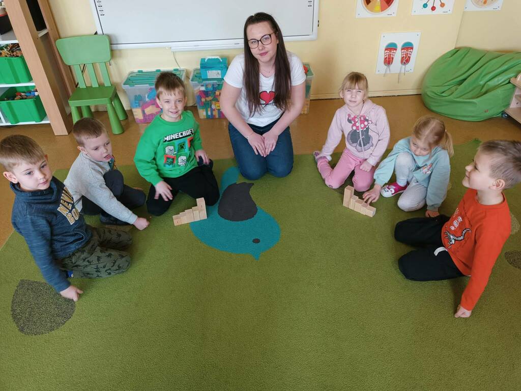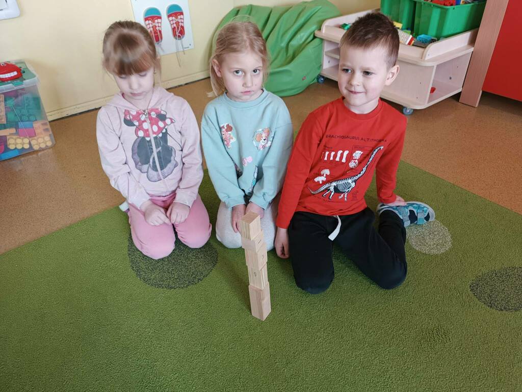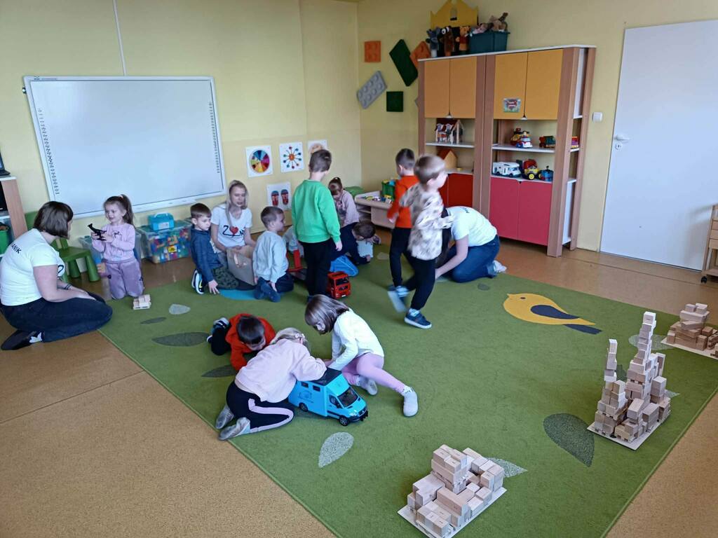 Podczas zajęć dzieci pracowały w małych grupach — układały klocki na paletach, budowały wieże oraz segregowały elementy od najmniejszego do największego, rozwijając przy tym współpracę i logiczne myślenie.