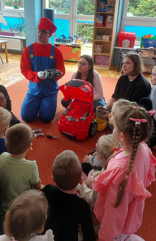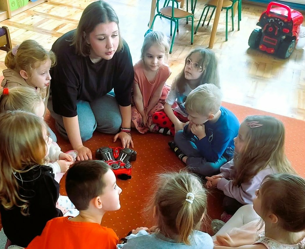 Młodzież zaprezentowała podstawowe narzędzia wykorzystywane w tym zawodzie oraz opowiedziała, jak wygląda samochód „pod maską”. Dzieci miały również okazję spróbować swoich sił w praktycznych działaniach – wkręcały i wykręcały śruby, poznając, jak wygląda zmiana koła, a także pracowały w zespołach, składając pojazdy z różnych elementów. Ćwiczenia te rozwijały współpracę oraz logiczne myślenie.