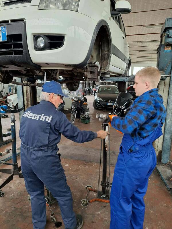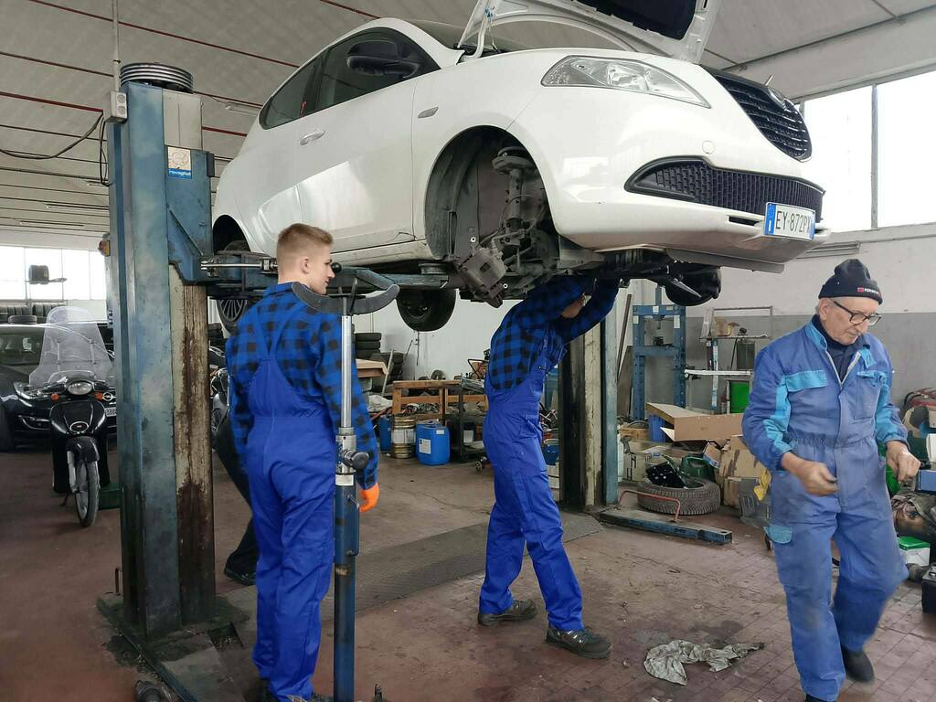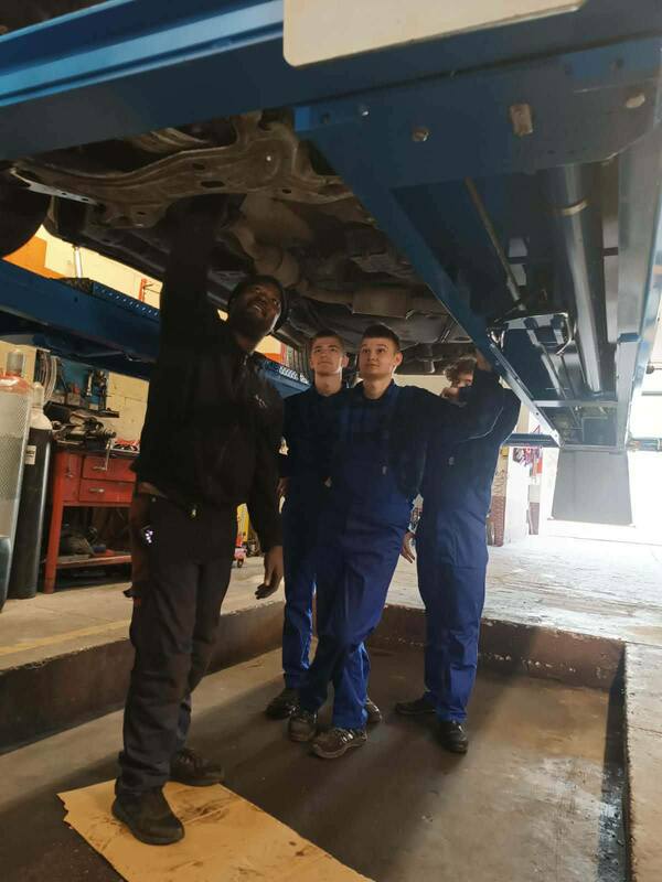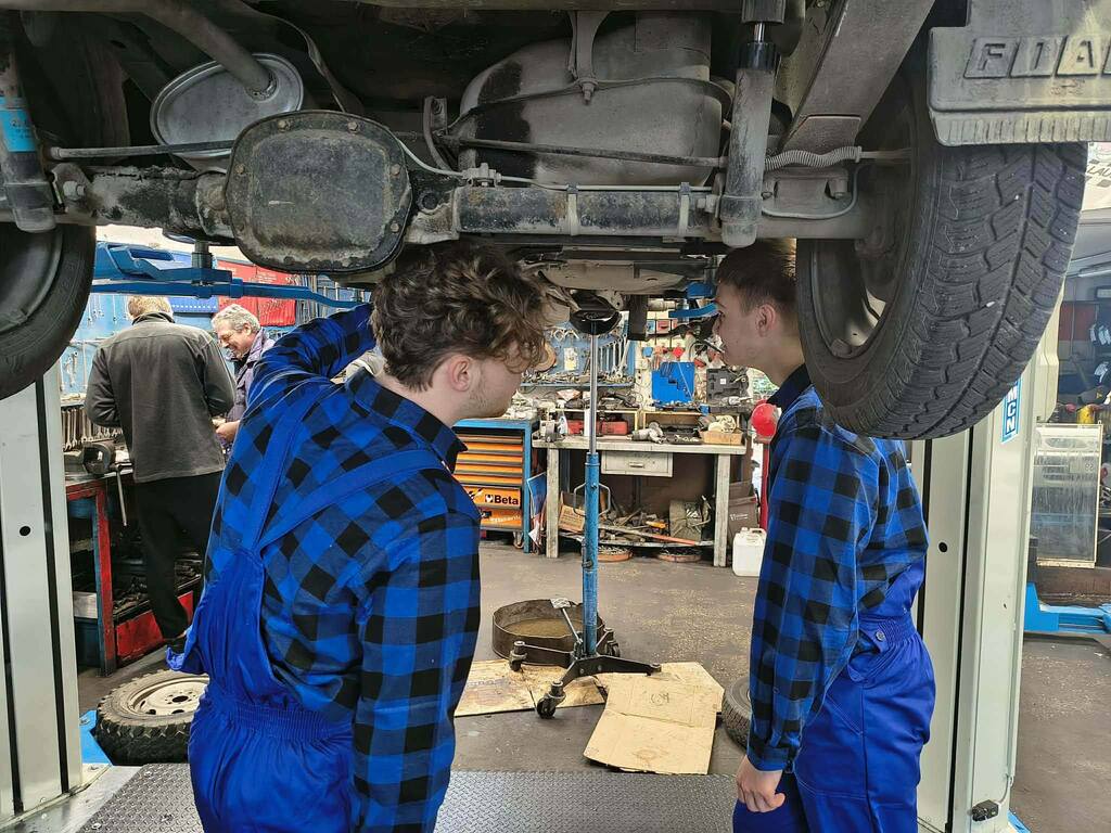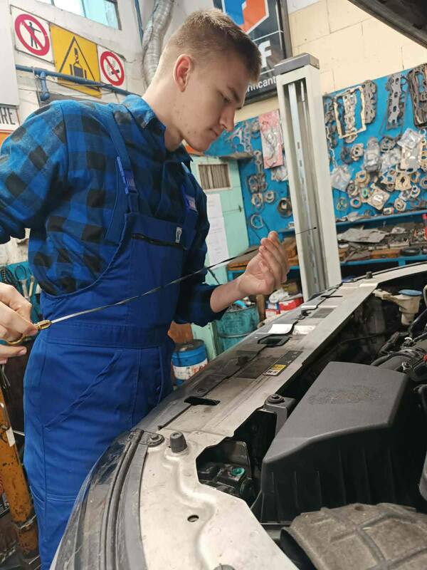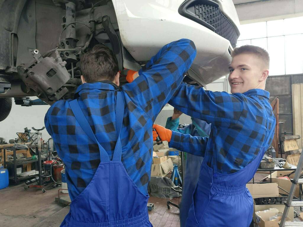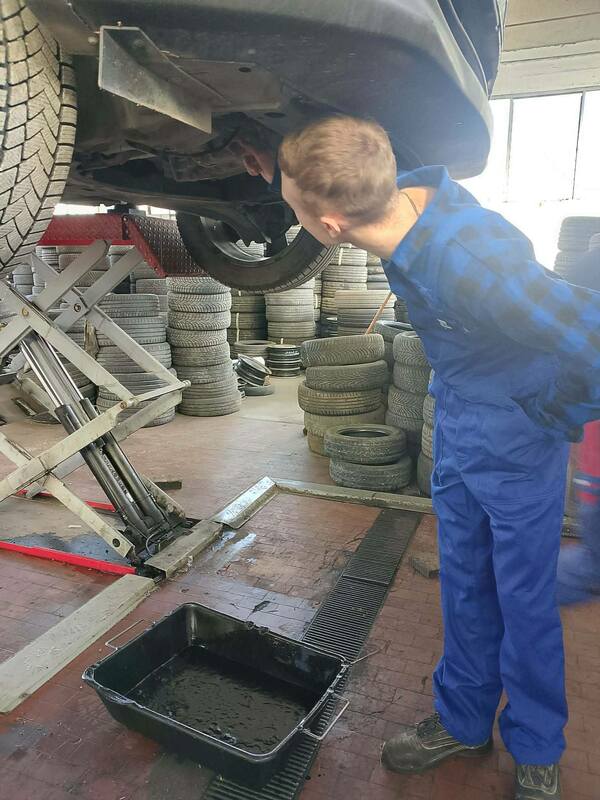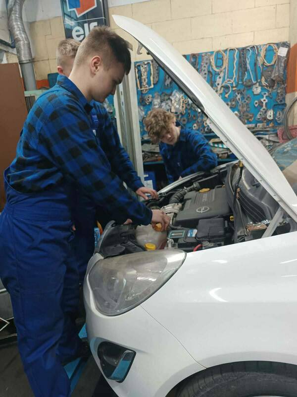 Podczas zajęć praktycznych uczniowie technikum pojazdów samochodowych wykonują prace związane z obsługą i naprawą układów mechanicznych pojazdu. Zakres działań obejmuje wymianę klocków oraz tarcz hamulcowych, a także czyszczenie zacisków i jarzma oraz odpowietrzanie układu hamulcowego. Ponadto przeprowadzają wymianę wahaczy oraz tulei metalowo-gumowych, co pozwala na poprawę stanu zawieszenia pojazdu. W ramach zajęć wykonują również wymianę oleju silnikowego wraz z filtrami – oleju, powietrza oraz paliwa.